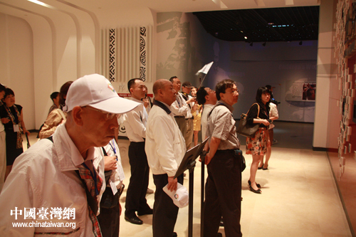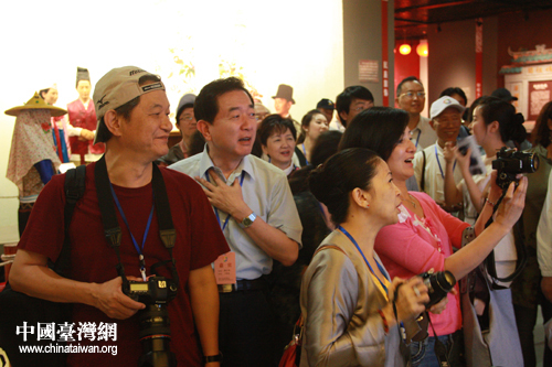 臺(tái)嘉賓團(tuán)團(tuán)長(zhǎng)前;鶗(huì)副董事長(zhǎng)焦仁和(左二)在成都非遺博覽園參觀(中國(guó)臺(tái)灣網(wǎng) 趙輝 攝)