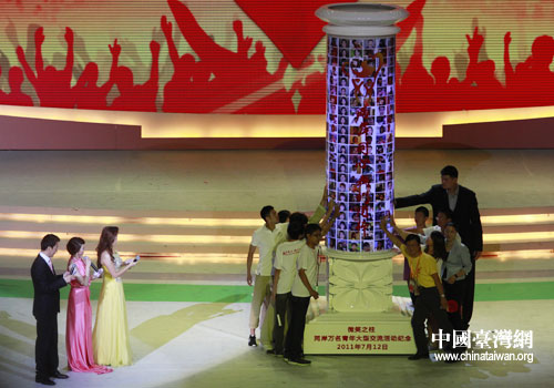 由中共中央臺(tái)辦、共青團(tuán)中央等17家單位共同主辦的兩岸萬名青年大交流活動(dòng),7月上旬在大陸各地陸續(xù)展開。兩岸青年大型交流主題聯(lián)歡活動(dòng)分為“我們同根”“我們同心”“我們同行”三個(gè)篇章,包括歌曲、舞蹈、武術(shù)、魔術(shù)等豐富多彩的文藝節(jié)目。孫楠、陳楚生、周杰倫、李宇春、林宥嘉、韓紅、成龍、宋祖英等一批深受兩岸青年喜愛的文藝明星先后登場(chǎng),為大家獻(xiàn)上一首首耳熟能詳?shù)木哂兄腥A傳統(tǒng)文化底蘊(yùn)的歌曲,劉謙的魔術(shù)、河南少林寺武術(shù)、臺(tái)灣少數(shù)民族舞蹈、中國(guó)殘疾人藝術(shù)團(tuán)的“千手觀音”也贏得現(xiàn)場(chǎng)觀眾的陣陣歡呼聲。