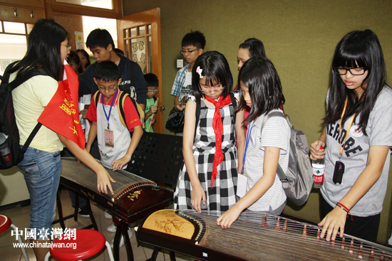 音樂(lè)教室內(nèi),學(xué)生們好奇地?fù)崤殴~。(中國(guó)臺(tái)灣網(wǎng) 王思羽 攝)