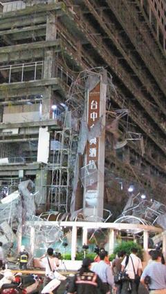 臺中市金典酒店正在改建,昨天傍晚10層高的施工鷹架突然倒塌,路人驚嚇奔逃,12人受傷。圖片來源:臺灣《聯(lián)合報》