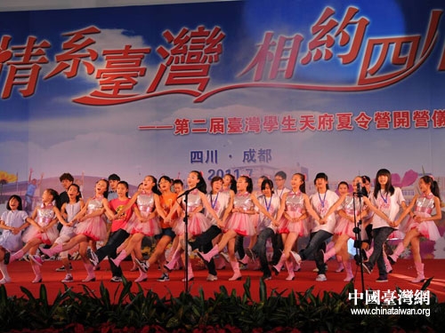 川臺兩地學(xué)生在開營儀式上共同表演了精彩的文藝節(jié)目。圖片來源:四川省臺辦