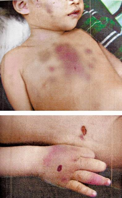 賴姓女童胸部有大片虐打傷痕(上),手腳也有煙頭痕跡(下)。圖片來源:臺灣媒體