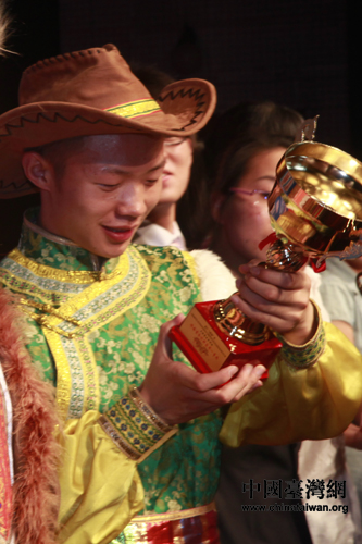“來之不易的獎杯呀,我得好好看看!”。(中國臺灣網 郜利敏 攝)