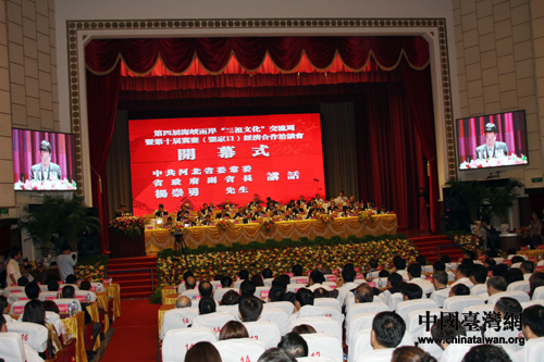 第四屆海峽兩岸“三祖文化”交流周暨第十屆冀臺經(jīng)濟合作洽談會今天下午在張家口開幕。中共中央臺辦、國務院臺辦主任王毅、海協(xié)會會長陳云林、河北省委副書記付志方以及中國國民黨副主席林豐正、全國臺企聯(lián)會長郭山輝等1200多名海峽兩岸各界人士出席開幕式。(中國臺灣網(wǎng) 王偉 攝)