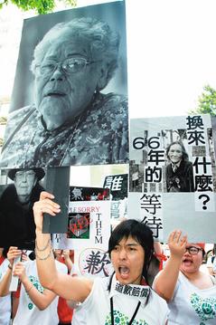 臺灣婦女救援基金會10日發(fā)起“一個道歉、還她自由”抗議活動,抗議成員手持“慰安婦”幸存者照片發(fā)出怒吼,要求日本政府對慰安婦事件正式道歉。來源:臺灣《聯(lián)合報》