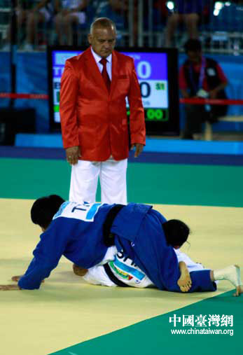 中華臺(tái)北隊(duì)選手連珍羚緊緊壓制住對(duì)手。(中國臺(tái)灣網(wǎng) 劉海偉 攝)