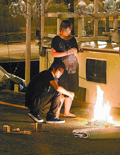 徐姓女子(右)見兒子遺體被打撈上岸,難過地幫兒子燒冥紙。圖片來源:臺(tái)灣媒體