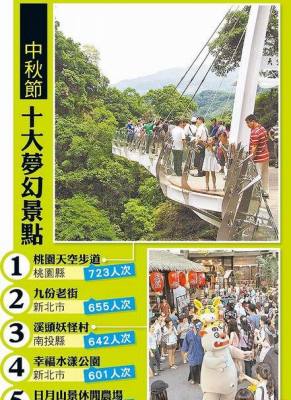 中國臺灣網(wǎng)9月12日消息 據(jù)臺灣媒體報(bào)道,11日,臺灣美食休閑分享網(wǎng)站“愛評網(wǎng)”公布網(wǎng)友票選中秋節(jié)最想去的10大夢幻景點(diǎn),桃園縣復(fù)興鄉(xiāng)的天空步道摘得桂冠,新北市九份老街和南投縣溪頭妖怪村分列2、3名。