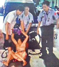 這時有人從旁拿來一個大型黑色垃圾袋,把老嫗的重要部位遮起來,警方也不斷在旁勸說,才將情緒逐漸平復(fù)的她送上警車;這時許多民眾被此景吸引,紛紛圍觀議論,其中一名老人看得興起,欲罷不能擠到警車旁想看得更仔細(xì),被警方請開。