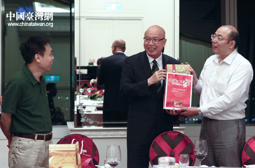康師傅集團(tuán)華北地區(qū)董事長(zhǎng)張百清在臺(tái)北101大樓會(huì)見“康師傅橋——大陸網(wǎng)絡(luò)媒體高層赴臺(tái)交流參訪團(tuán)”一行,圖為雙方互贈(zèng)禮物。(中國(guó)臺(tái)灣網(wǎng) 陳佳慧 攝)