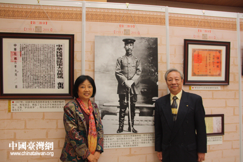 兩位臺胞在投身辛亥革命的先輩像前合影留念。(中國臺灣網(wǎng) 楊麗 攝)