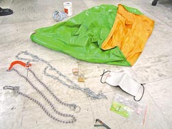 兇殘沒(méi)人性主嫌劉少祺以圖中帆布袋、口罩及膠帶等將被害人耳口蓋住,并將白膠灌進(jìn)其耳朵中,甚至將狗鏈栓在被害人身上,以滿足自己的變態(tài)欲望。圖片來(lái)自臺(tái)灣媒體