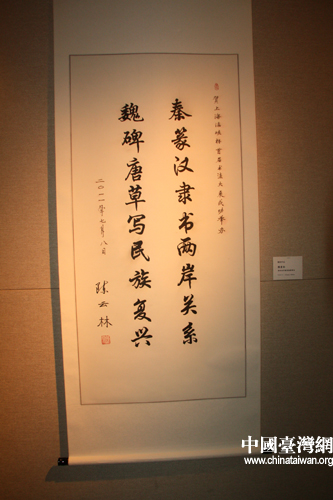 海協(xié)會會長陳云林書法作品“秦篆漢隸書兩岸關(guān)系 魏碑唐草寫民族復(fù)興” (中國臺灣網(wǎng) 李桂英 攝)