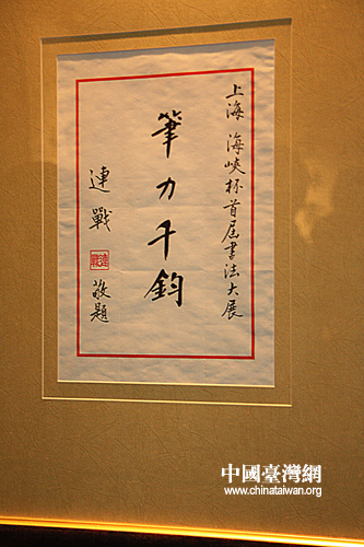 中國國民黨榮譽(yù)主席連戰(zhàn)的書法作品“筆力千鈞”(中國臺(tái)灣網(wǎng) 李桂英 攝)