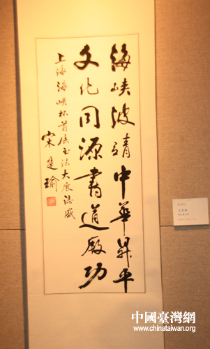 親民黨主席宋楚瑜的書法作品“海峽波清中華升平 文化同源書道厥功”(中國(guó)臺(tái)灣網(wǎng) 李桂英 攝)