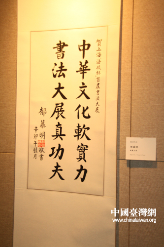 新黨主席郁慕明的書法作品“中華文化軟實(shí)力 書法大展真功夫”(中國(guó)臺(tái)灣網(wǎng) 李桂英 攝)