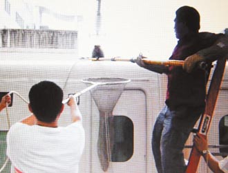這只獼猴大鬧三小時(shí)后,圍捕人員射出四支麻醉箭,獼猴中箭跌落高鐵車廂上。(圖片來(lái)源:臺(tái)灣《聯(lián)合報(bào)》)