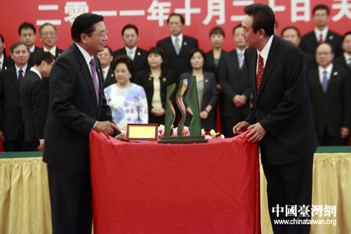 ;鶗(huì)董事長(zhǎng)江丙坤向海協(xié)會(huì)會(huì)長(zhǎng)陳云林贈(zèng)送禮物“行健不息”。(中國(guó)臺(tái)灣網(wǎng) 陳佳慧 攝)