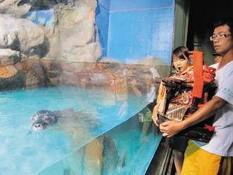 嘉義奉天宮開臺媽祖臨時(shí)“指示”信徒到臺灣海洋館參觀,信徒雙手捧著神像“觀賞” 缸里的海豹。圖片來自臺灣媒體