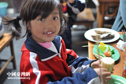 圖為玉樹孩子在大哥哥大姐姐的照顧下開心地用餐。 (宋慶齡基金會志愿者 許慶慶 攝)