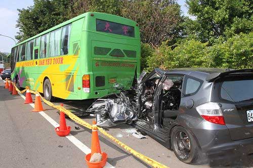 中國(guó)臺(tái)灣網(wǎng)11月5日消息 據(jù)臺(tái)灣媒體報(bào)道,今天凌晨,臺(tái)軍六軍團(tuán)一名中士周姓炮長(zhǎng)(22歲)在卡拉OK飲酒狂歡后,駕駛一輛轎車搭載呂姓(22歲)、彭姓(23歲)等友人,行經(jīng)新竹縣竹東鎮(zhèn)工業(yè)二路上,追撞停放路旁的游覽車車尾,撞擊力道猛烈,17噸重的游覽車遭推離原位偏斜。警方封鎖現(xiàn)場(chǎng)調(diào)查中。