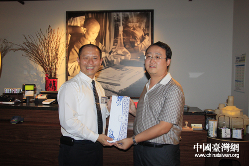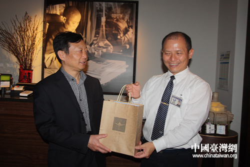 北京交通大學(xué)學(xué)生工作處副處長張博與慈濟(jì)基金會代表交換禮物(中國臺灣網(wǎng) 徐維彬 攝)