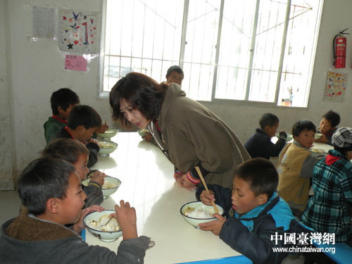 張平宜在學(xué)生餐廳陪著孩子們用餐(圖片來(lái)源:四川省臺(tái)辦)