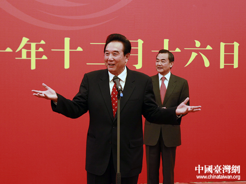 12月16日,紀念海峽兩岸關系協(xié)會成立20周年招待酒會在北京人民大會堂舉行。圖為海協(xié)會會長陳云林(左)在招待酒會上致祝酒詞。(中國臺灣網(wǎng) 王偉 攝)