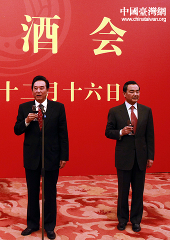 12月16日,紀念海峽兩岸關系協(xié)會成立20周年招待酒會在北京人民大會堂舉行。圖為海協(xié)會會長陳云林(左),中共中央臺辦、國務院臺辦主任王毅在招待酒會上祝酒。(中國臺灣網(wǎng) 王偉 攝)