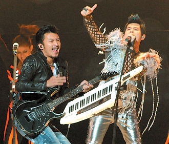 周杰倫(右)高雄演唱會(huì),昨一開(kāi)場(chǎng)便與謝霆鋒互飆樂(lè)器,臺(tái)下歌迷尖叫。(圖片來(lái)源:臺(tái)灣《聯(lián)合報(bào)》)