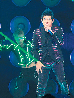 周杰倫高雄演唱會(huì),周杰倫(右)與舞群穿著LED炫閃裝,十分吸睛。(圖片來(lái)源:臺(tái)灣《聯(lián)合報(bào)》)