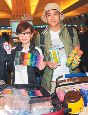 “饑餓30小時(shí)”代言人彭于晏(右)、郭采潔昨日準(zhǔn)備禮物,出發(fā)到肯尼亞。(圖片來源:臺灣《聯(lián)合報(bào)》)
