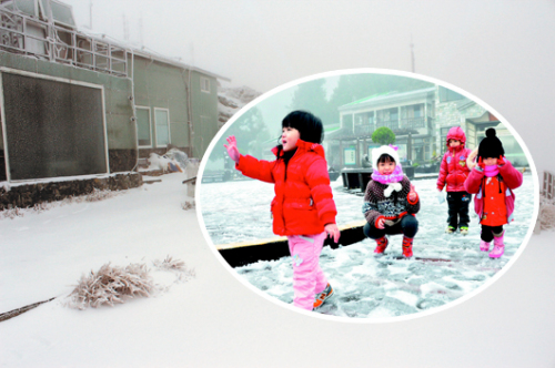 昨天清晨,臺灣降下龍年的第一場瑞雪,小朋友高興地踏雪拍照。(圖片來源于:臺灣《聯(lián)合報》)