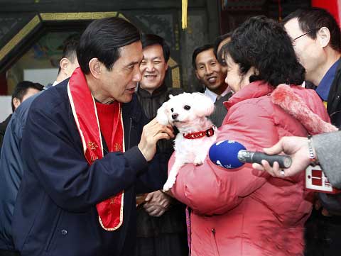 遇到熱情民眾對(duì)他說“我愛你”,馬英九也俏皮回說“我也愛你”。與戴著各式動(dòng)物造型毛帽的小朋友合照時(shí),他不忘幽默補(bǔ)充說“還有一匹馬”。而看到抱寵物狗來領(lǐng)福袋的主人,馬英九則加碼多發(fā)一包福袋,開玩笑對(duì)狗兒說“這是馬小九給你的”。