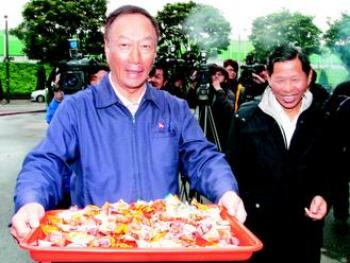 臺灣鴻海集團昨天舉辦新春團拜會,董事長郭臺銘(左)手拿糖果拜年。(圖片來源于:臺灣《聯(lián)合報》)