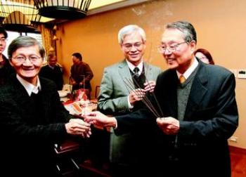 臺灣宏碁集團高層主管昨天到創(chuàng)辦人施振榮(右)家中拜年,并祭拜施振榮供奉的地母,祈求來年平安順利。(圖片來源于:臺灣《聯(lián)合報》)