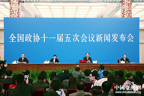2日下午3時,全國政協(xié)十一屆五次會議新聞發(fā)布會在北京人民大會堂三樓大廳舉行,大會新聞發(fā)言人趙啟正介紹了會議相關(guān)情況,并回答了中外記者提問。(中國臺灣網(wǎng) 于斯文 攝)