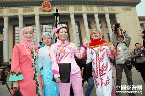 十一屆全國(guó)人大五次會(huì)議5日上午在北京開(kāi)幕,來(lái)自全國(guó)各地的少數(shù)民族代表們身著民族盛裝步入大會(huì)堂。(中國(guó)臺(tái)灣網(wǎng) 王偉 攝)