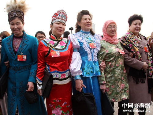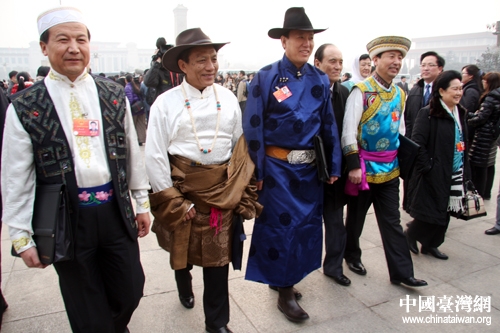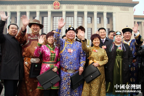 十一屆全國(guó)人大五次會(huì)議5日上午在北京開幕,來自全國(guó)各地的少數(shù)民族代表們身著民族盛裝步入大會(huì)堂。(中國(guó)臺(tái)灣網(wǎng) 王偉 攝)
