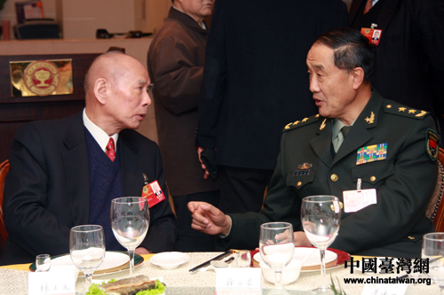 3月8日,黃埔軍校同學(xué)會(huì)在京舉辦兩會(huì)代表、委員聯(lián)誼招待會(huì)。圖為林上元與全國(guó)人大代表徐小巖交談。(中國(guó)臺(tái)灣網(wǎng) 王偉 攝)