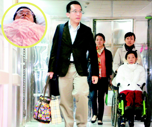 吳淑珍(前右)由媳婦黃睿靚(后右)、兒子陳致中(前左)、女兒陳幸妤(后左)陪同,到桃園醫(yī)院探視陳水扁(圓圖),一家人昨日在戒護病房團聚。(圖片來源:臺灣《聯(lián)合報》)
