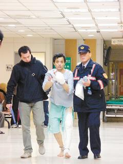 涉嫌縱火的新竹市男子彭建源(中),他的雙手及左腳也被燒傷。(圖片來源:臺灣《聯(lián)合報》)
