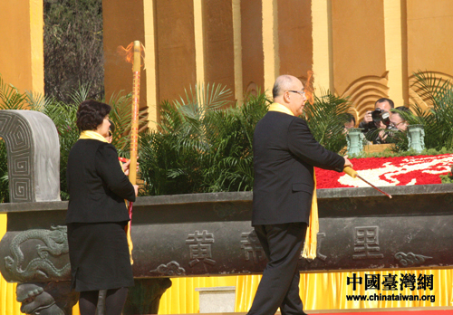 中國(guó)國(guó)民黨榮譽(yù)主席吳伯雄偕其夫人戴美玉出席壬辰年黃帝故里拜祖大典并向軒轅黃帝敬獻(xiàn)頭香。