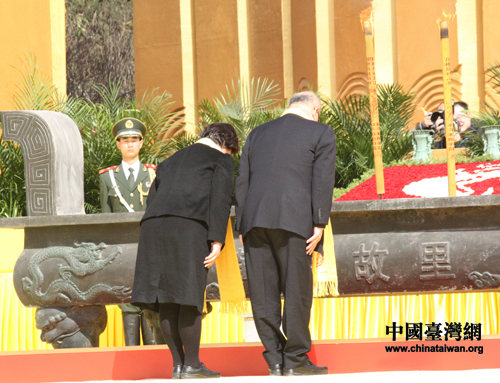 壬辰年黃帝故里拜祖大典于3月24日上午在河南新鄭市隆重舉行,圖為中國(guó)國(guó)民黨榮譽(yù)主席吳伯雄偕同夫人戴美玉上香禮畢后向黃帝像鞠躬致敬。(中國(guó)臺(tái)灣網(wǎng) 王文英 攝)