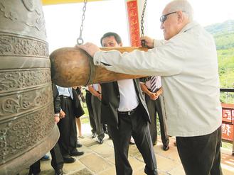 李登輝(右)日前為恒春生態(tài)農(nóng)場的“綿鐘攬月樓”揭碑,并登上鐘樓,撞鐘33次。(圖片來源:臺灣《聯(lián)合報》)