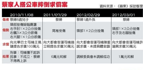 據(jù)報道,“跌倒姐”家住臺北市東湖地區(qū),平常以公交車為交通工具,前年她帶8歲兒子搭光華巴士公交車,不滿兒子摔倒受傷,憤而向女司機(jī)王珮璉求償100萬元。隔年7月、今年2月29日及3月1日,“跌倒姐”3度以大都會司機(jī)車速過快害她及外孫摔傷、擦傷為由,并附上診斷證明提告,其中2起要求賠償各30萬元,共計(jì)向司機(jī)索賠160萬元。