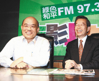 主持電臺節(jié)目的長謝長廷(右),昨天邀參選民進黨主席的蘇貞昌(左)接受訪問,兩人互動和樂。(圖片來源:臺灣《聯(lián)合報》)
