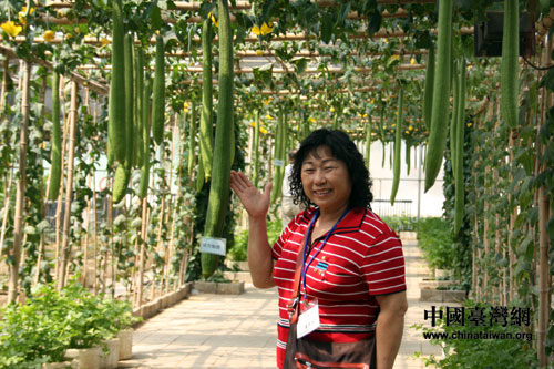 圖為臺(tái)灣基層民眾代表在生態(tài)園絲瓜種植區(qū)。(中國臺(tái)灣網(wǎng) 郜利敏 攝)