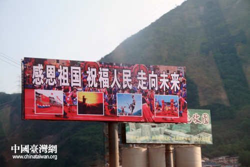 從遺址前往新北川,高速路邊巨大的感恩標(biāo)語(yǔ)。(中國(guó)臺(tái)灣網(wǎng) 楊麗 攝)