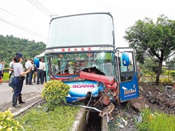 宜蘭梅花湖風景區(qū)發(fā)生重大車禍,游覽車撞上民宅圍墻(圖)造成車內(nèi)37人受傷,駕駛座擋風玻璃全部碎裂,司機首當其沖,雙腿骨折受傷最嚴重。(圖片來源:臺灣《中國時報》)